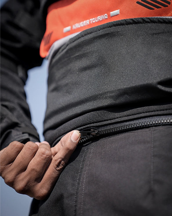 Kruger features a wide pant zip connector to keep the armour & abrasion-resistant materials closer to their intended protective positions at all times ensuring the jacket and pants don't ride apart during a crash.