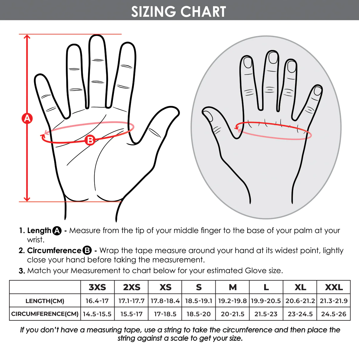 Find your glove size by checking hand measurements against the chart provided - If both the measurements do not fall in one particular size - use the larger of the two measures to choose the glove size. - If the two measurements are on the border line between two sizes, try both the sizes and choose the one that offers a better fit.