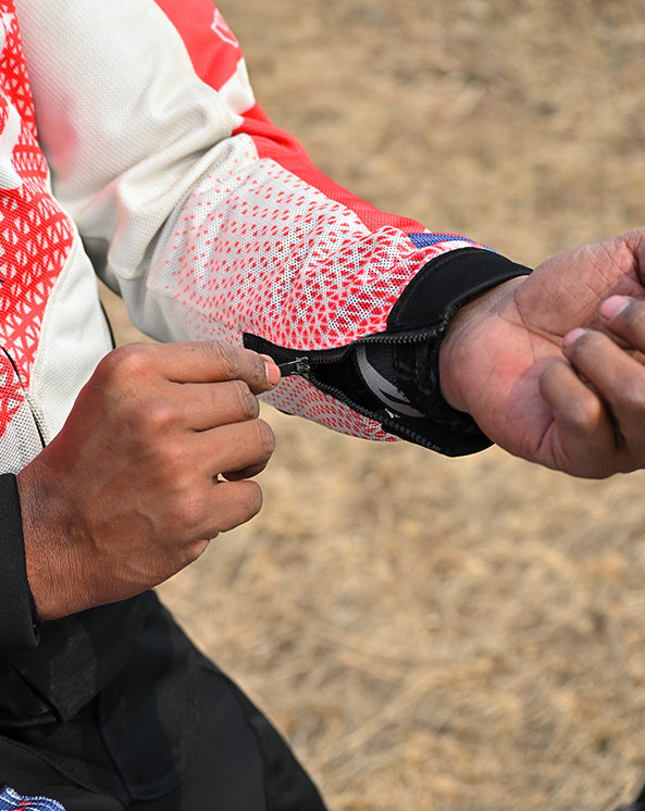 The wrist area features a zippered closure with an auto-lock YKK slider, preventing the zip from accidentally opening while you're on the move. The hem of the sleeve is made with soft neoprene fabric, providing a smooth edge that won't chafe or irritate your skin. The zippered wrist opening allows you to adjust the constraint to your individual preference, ensuring a perfect fit. This added feature allows you to ride comfortably and without any distractions.