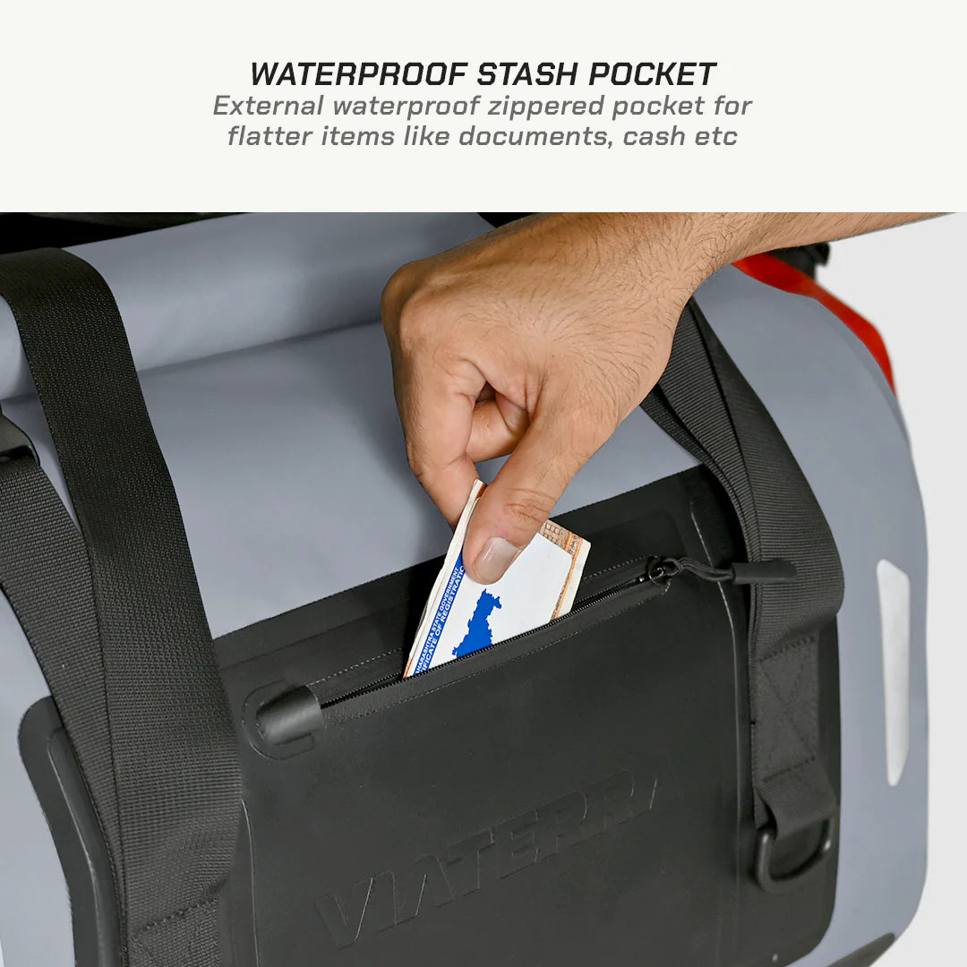 External waterproof zippered pocket for flatter items like documents, cash etc.