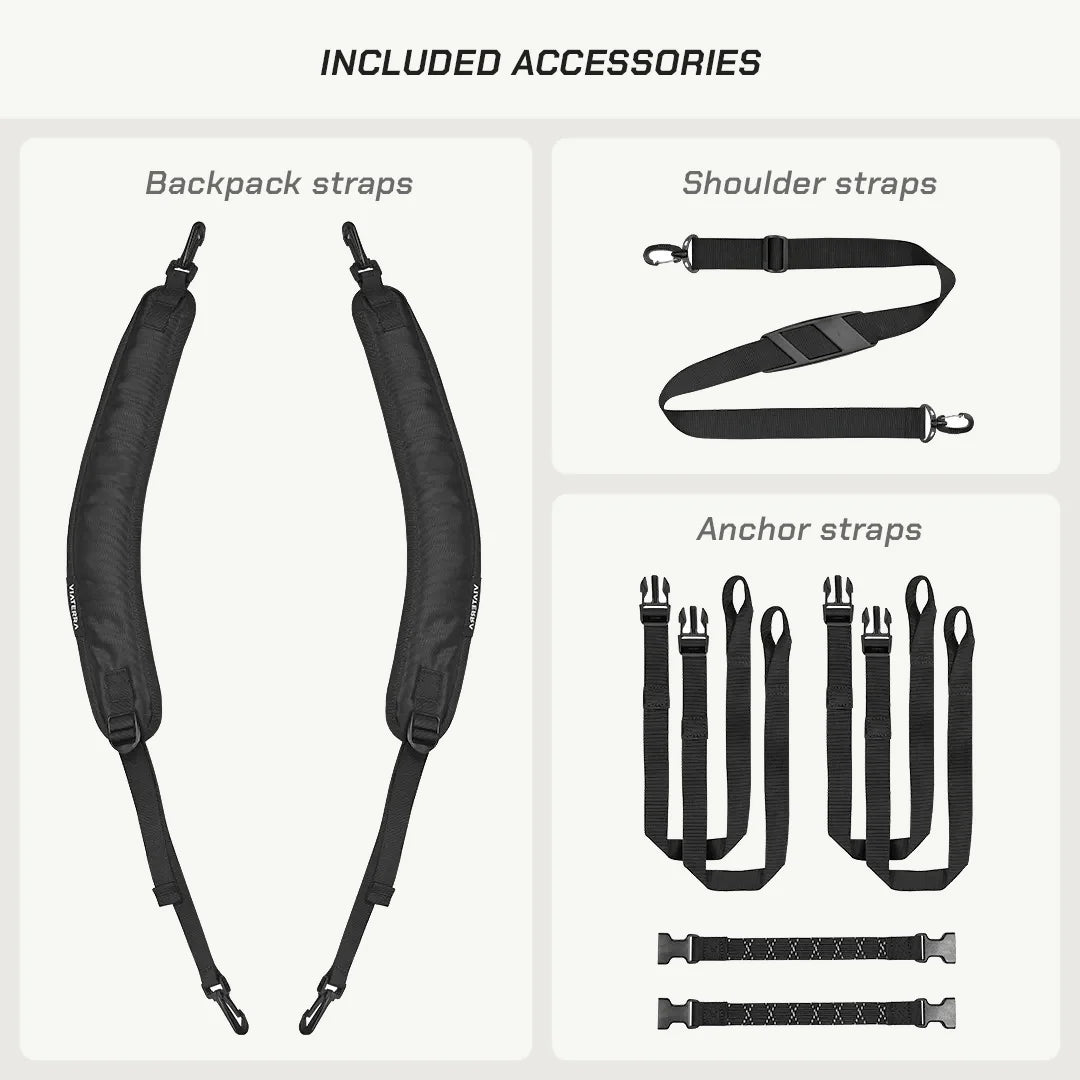 4 compression straps with heavy duty side release buckles allow you to cinch down according to the gear you are carrying