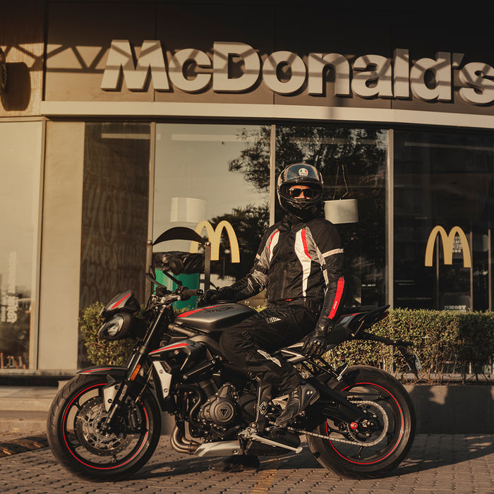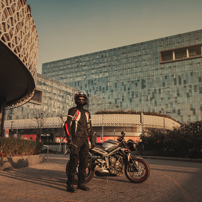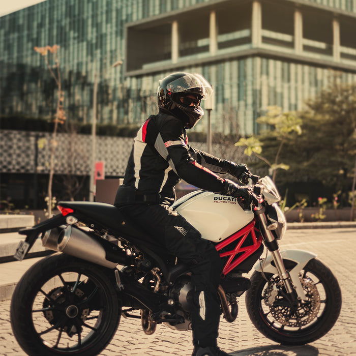 - The pre-curved knee ensures the armour is positioned properly without bulging when the knee is bent. This also ensures that the pants do not ride up when you sit on the bike.