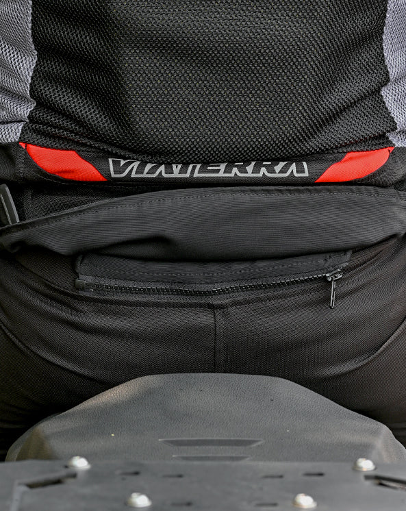The YKK jacket - pant connector zip offers lumbar protection by holding the jacket and pant together. It prevents the separation between garments in case of a crash and keeps you protected.