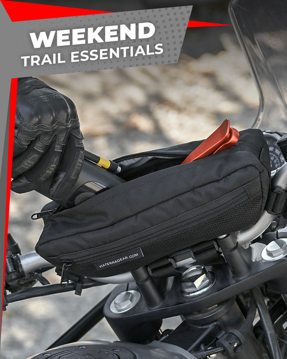 The handlebar trailpack features a MOLLE based mounting system that allows for universal fit on almost all handlebars without the centre bar.