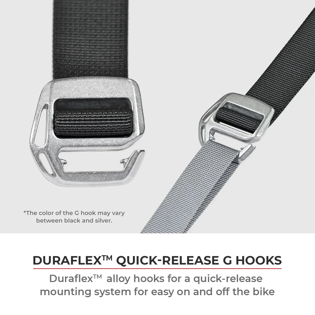 - Duraflex™ aerospace grade aluminum alloy mounting hooks for a quick-release mounting system for easy on and off the bike