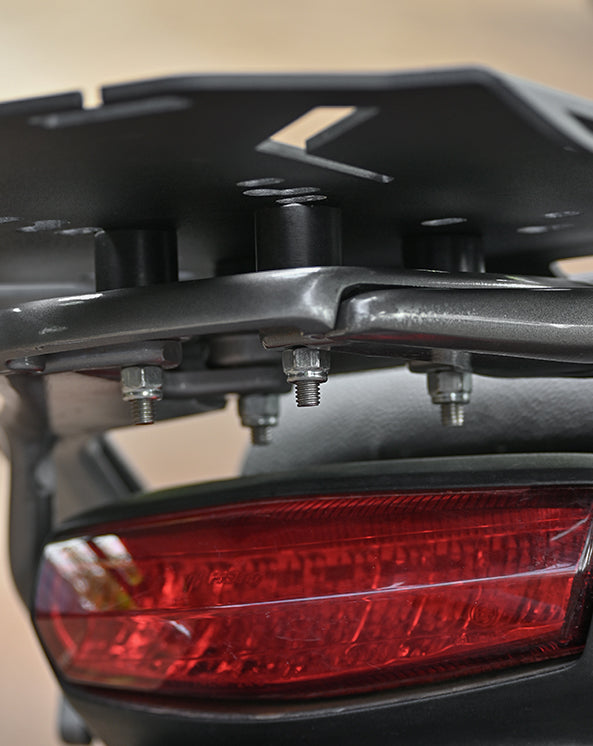 With this design, there is no requirement to remove the stock OEM pipe structure to mount this rear rack. This eliminates the need to make any permanent changes to your motorcycle, and allows you to easily remove the rack if you ever need to.
