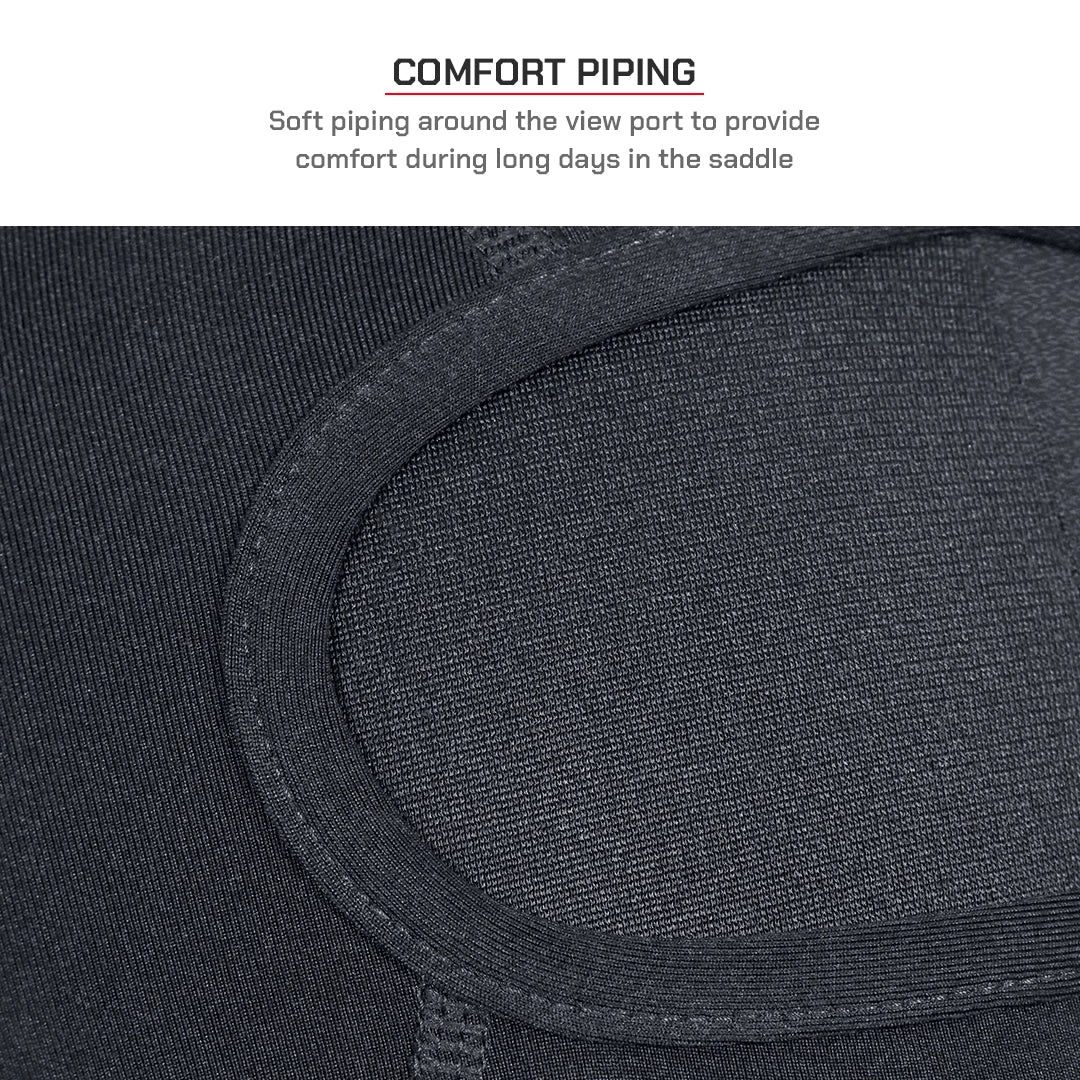 The ViaTerra 2nd Skin balaclava features soft piping around the viewport, which provides comfort during long days in the saddle. The soft piping is a strip of soft and flexible material that surrounds the viewport, which is the opening that allows you to see through the balaclava. The soft piping helps to prevent the viewport from rubbing against your skin, which can cause irritation and discomfort during long motorcycle rides.