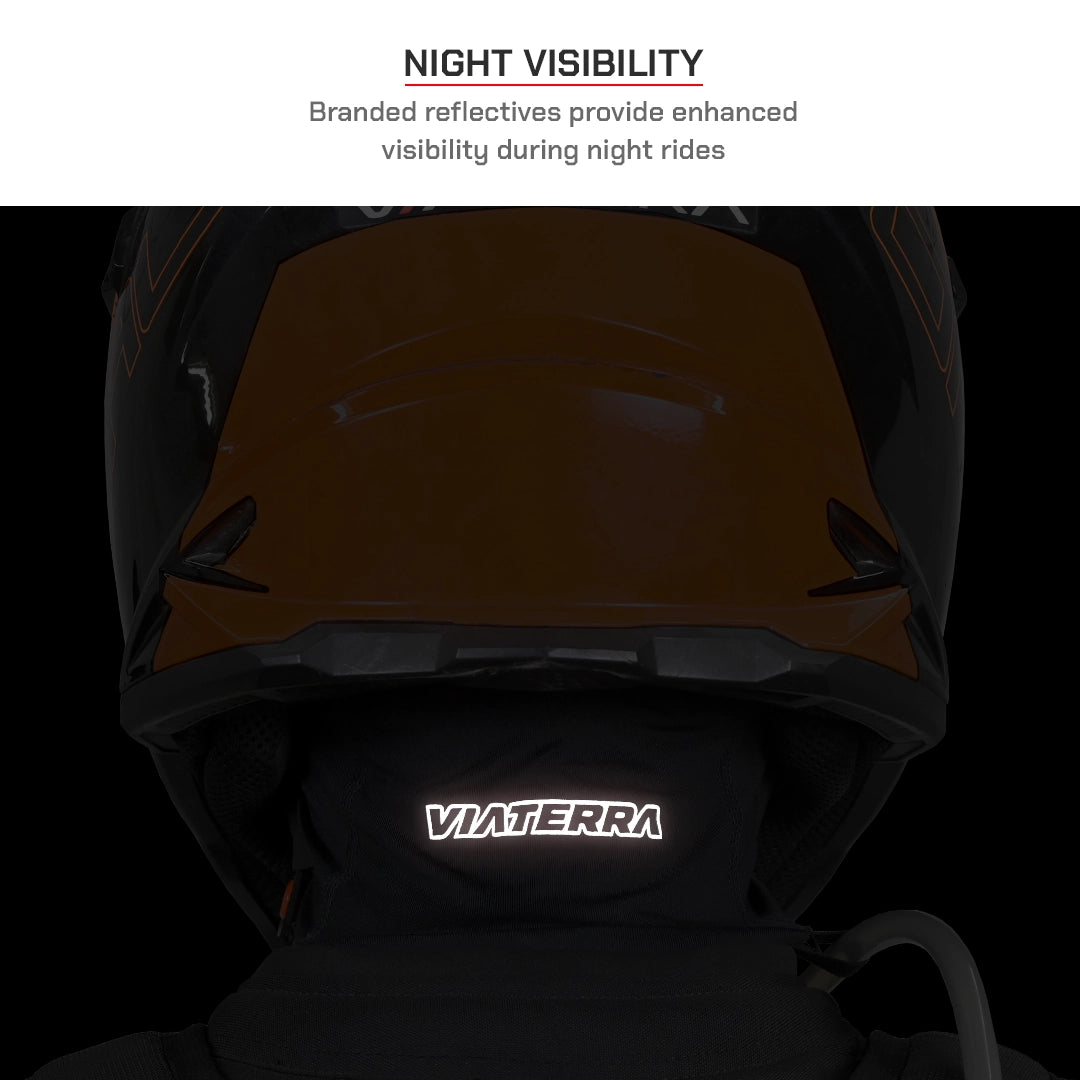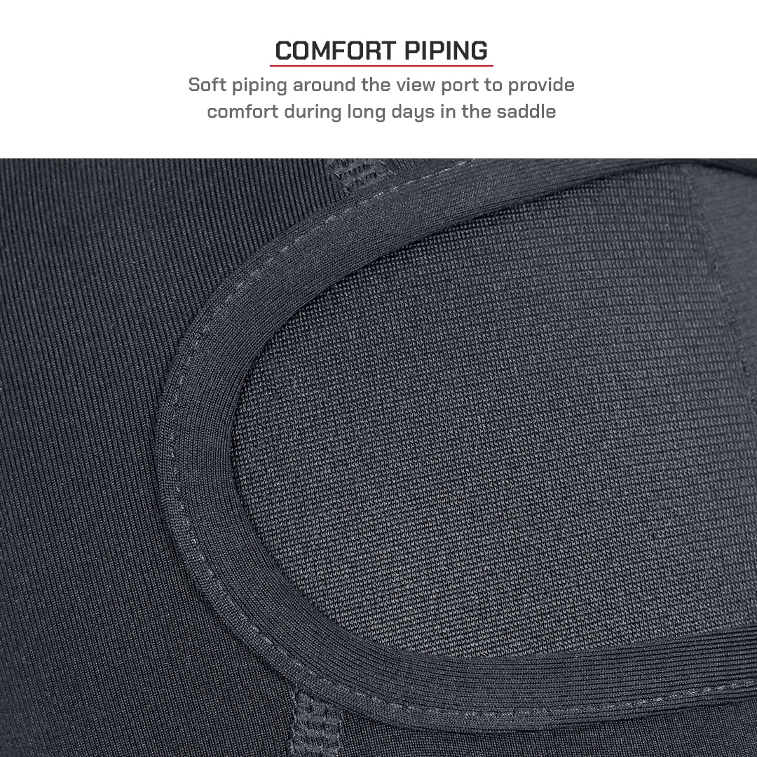 The ViaTerra 2nd Skin balaclava features soft piping around the viewport, which provides comfort during long days in the saddle. The soft piping is a strip of soft and flexible material that surrounds the viewport, which is the opening that allows you to see through the balaclava. The soft piping helps to prevent the viewport from rubbing against your skin, which can cause irritation and discomfort during long motorcycle rides.