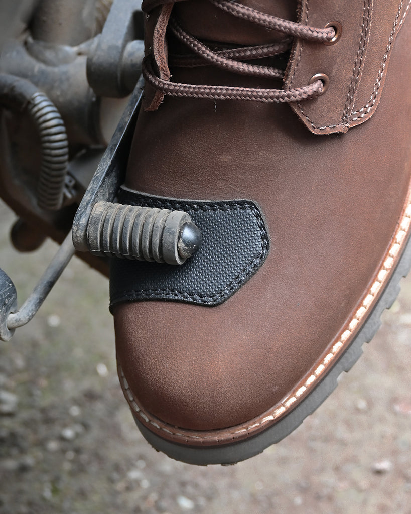 The in-built gear lever protector is a thoughtful addition designed to enhance functionality, no matter if you ride the old cast irons or the new age models. Made from a special polymer, it shields the boot from abrasion and scuffs caused by shifting gears. It seamlessly blends with the overall aesthetic of the boots, providing protection while not affecting the vintage-inspired charm.