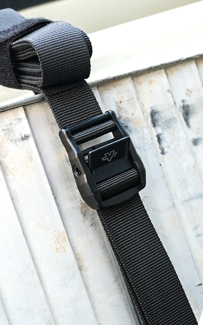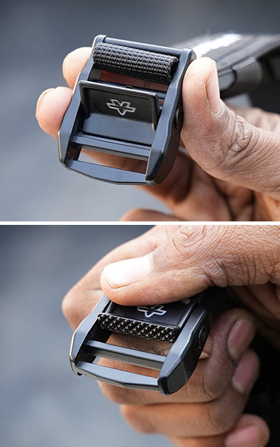 The spring-loaded cam buckle allows the webbing to slide freely when lifted and locks instantly when released, enabling precise tensioning and quick release without tools.