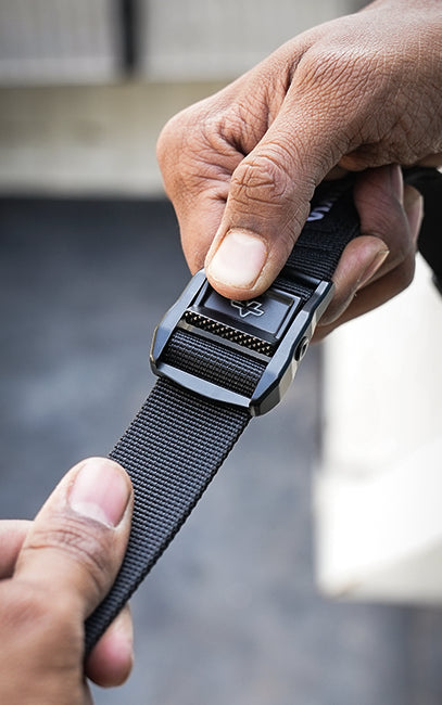 Manual cam buckle tensioning system using a friction-lock alloy buckle. The strap is routed through the buckle and tightened by hand to achieve controlled clamping force. Designed for flexible routing around racks, frames, grab rails, and luggage anchor points without fixed mounts or additional hardware, while maintaining tension under vibration.