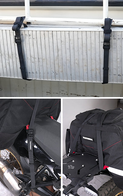 Suitable for securing soft luggage, and drybags on motorcycles, as well as general utility tie-down applications where controlled tension is required.