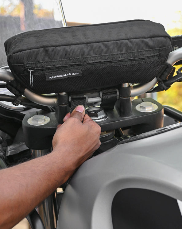 multiple loops makes it perfect for handlebars of any shape. fit a powerbank, my tws earbuds' case, wallet, a small biscuit packet and a couple of cables. pushed it inwards onto the tank instead of making it stand upright on the handlebar and there is no issue with the starps getting loose or moving around due to the wind even at decently high speeds. i only wish it was waterproof and slightly bigger. only thing i wanted to keep in this and wasnt able to along with the stuff above is a can of some cool drink. maybe a 2L option will make even more sense. the new waterproof version released literally 3-4 days after i bought this. sunglasses section with softer fabric is a really toughtful touch even if i dont use sunglasses too often