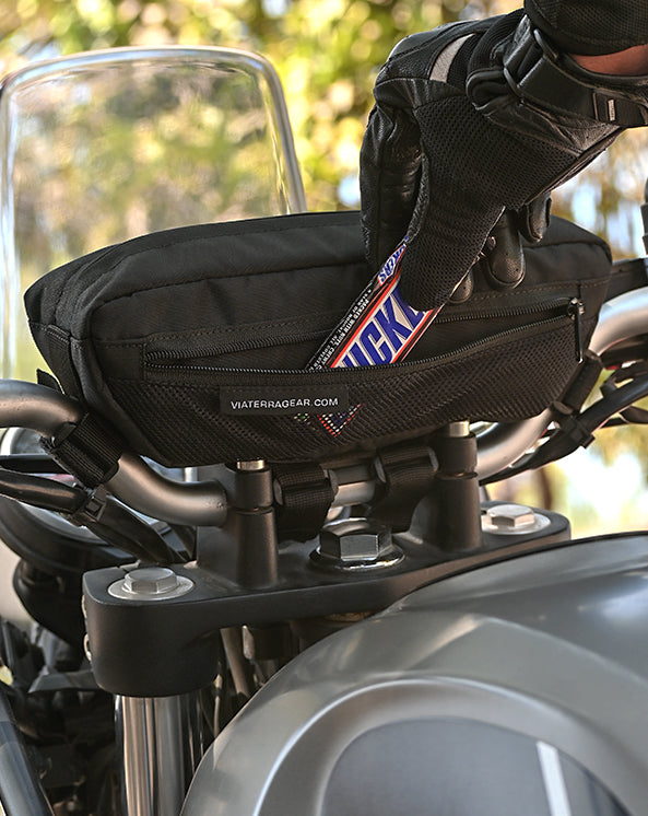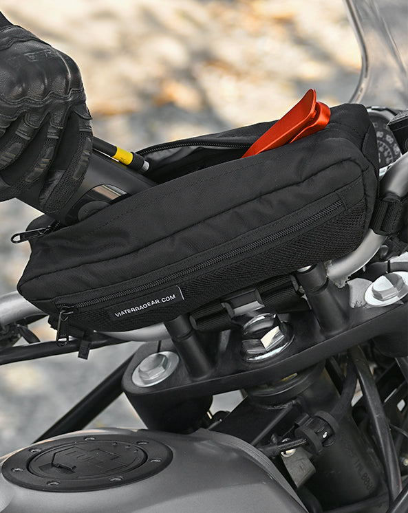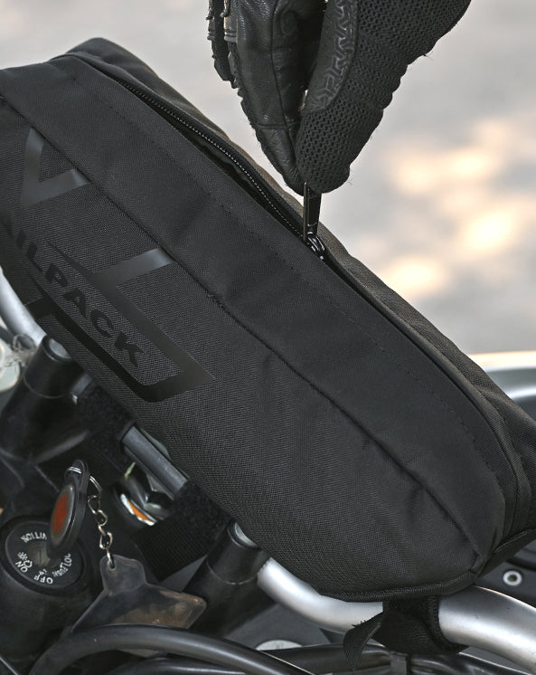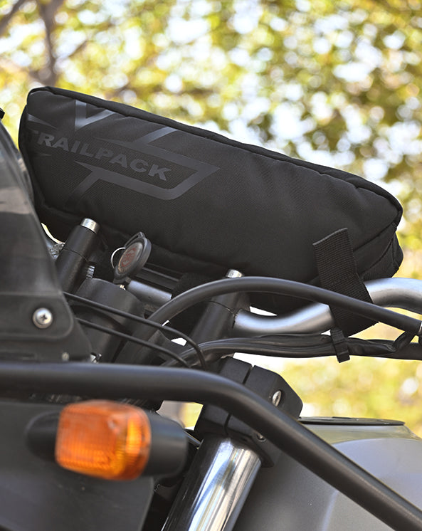 The Handlebar Bag offers a versatile and convenient solution for carrying all of your road essentials on the go. Its universal design allows it to fit most tyre irons, portable air compressors, sunglasses, snacks, wallet etc while also not interfering with any additional soft luggage that you may want to mount, allowing you to customize your ride to your specific needs. With easy access to all your essentials, the Handlebar bag is the perfect addition to any trail rider's setup!