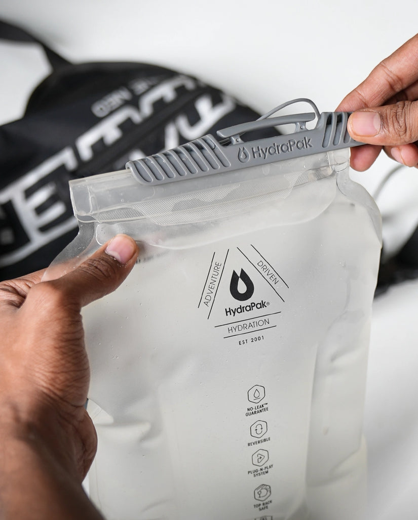 - The Hydrapak Bladder features a versatile center baffle that can be locked for a low-profile option of 1.5 liters or pulled apart for the full volume of 2 liters.