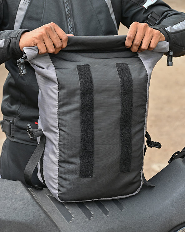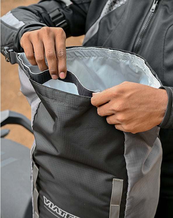 Comes with a ROLL TOP opening to enhance 100% waterproofing and make it easy to compress any extra volume. The top opening is rolled down (atleast 3 folds) and secured with a strap + buckle closure.