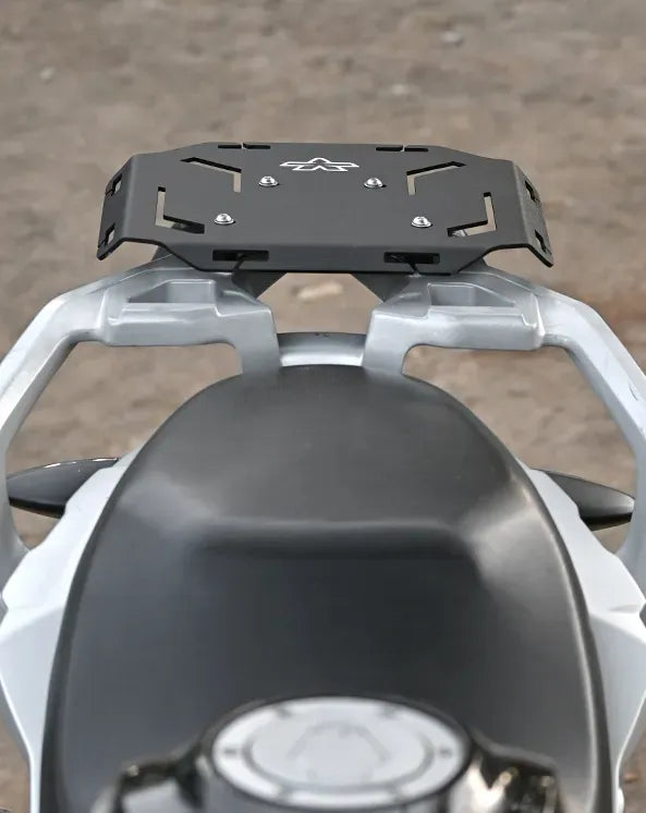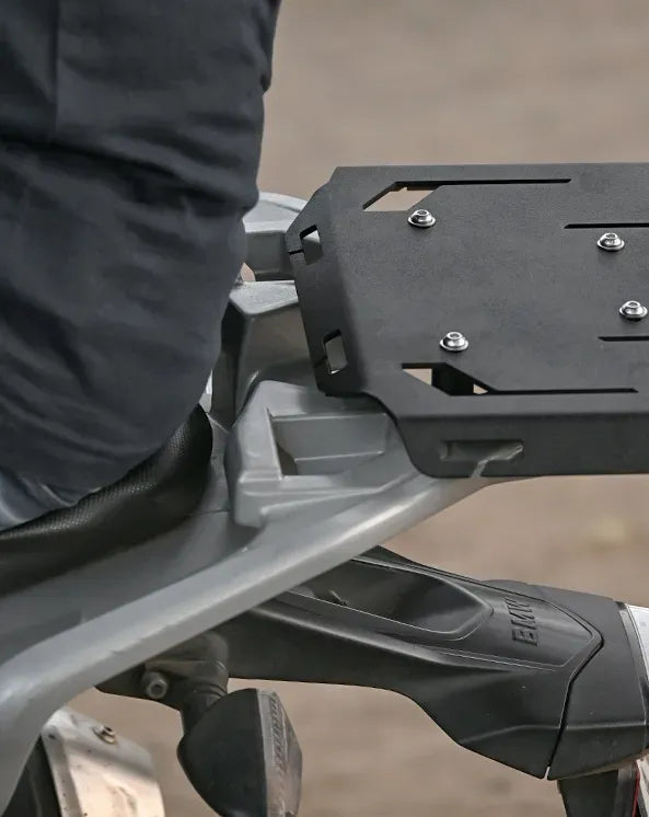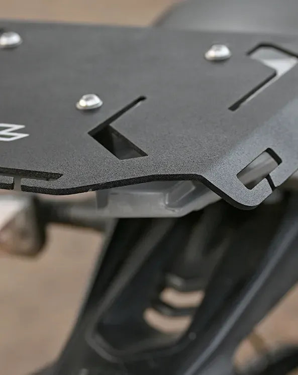 Designed specifically for the BMW G310 GS, this quick mount rear rack is precision laser-cut and CNC-bent from mild steel for superior strength and durability. Its matte powder-coated finish offers excellent corrosion resistance, while angled edges enhance rigidity to prevent flex under heavy loads. With a large surface area and quick release slots, it ensures easy and secure mounting of your luggage.