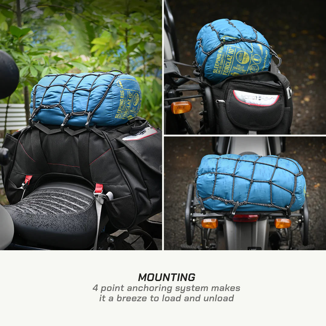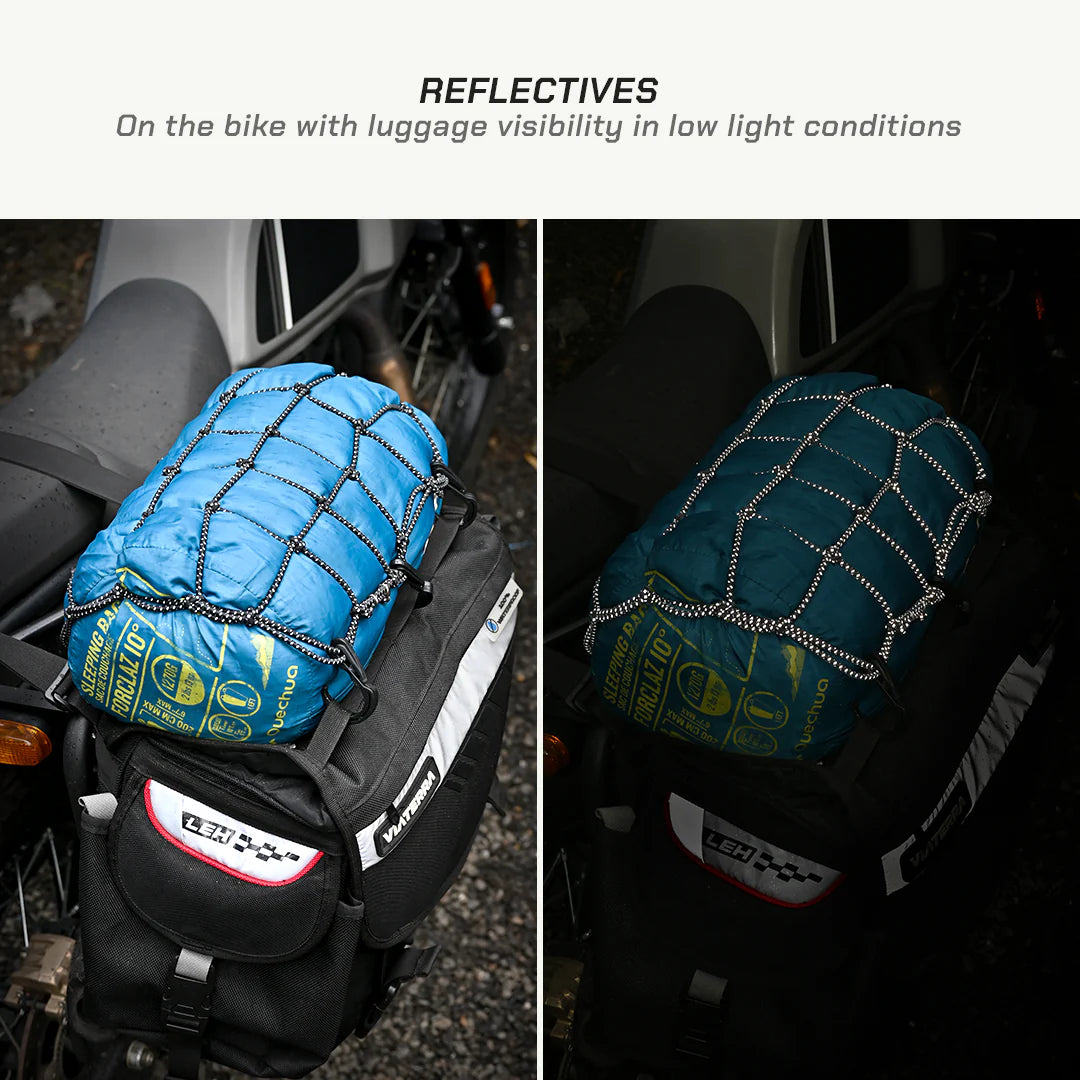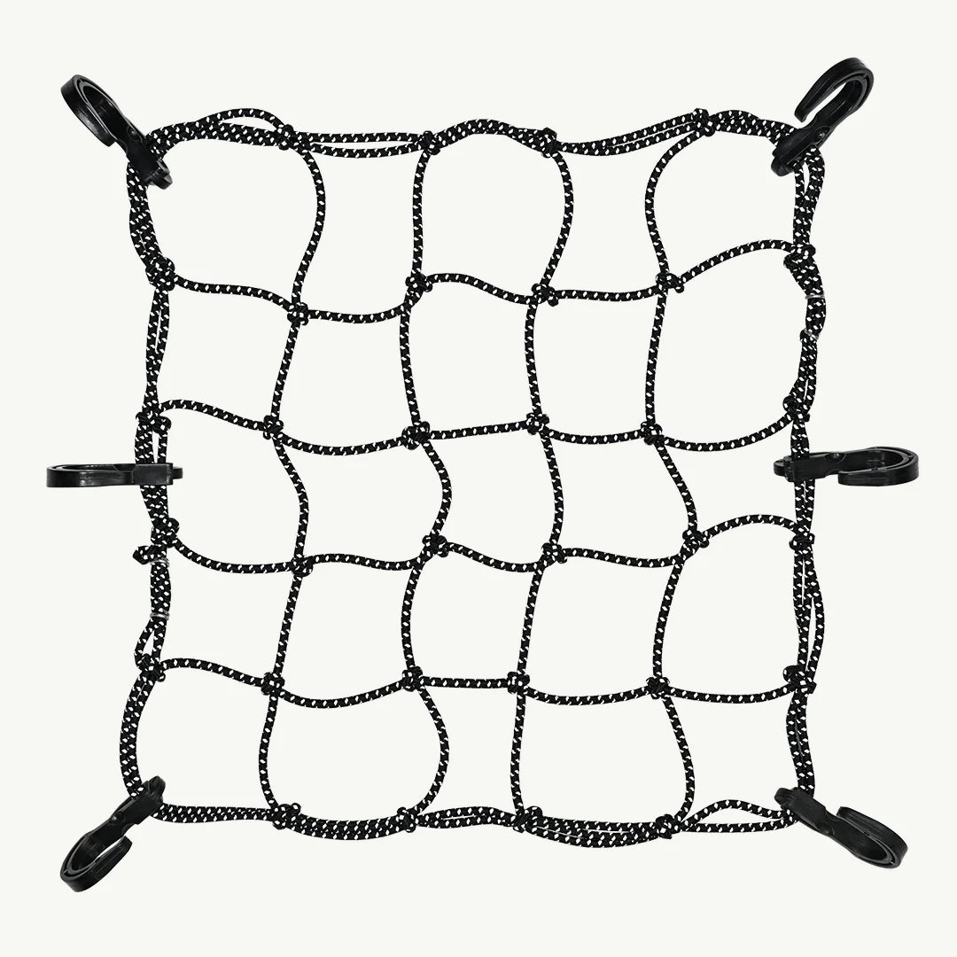 Made from high quality 4mm diameter rubber core with polyester sheath and plastic hooks, this 12 inch by 12 inch bungee net will help you fasten your gear better on your rides and enhance visibility with reflective