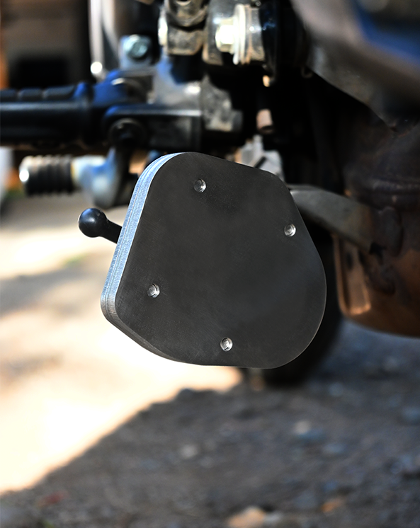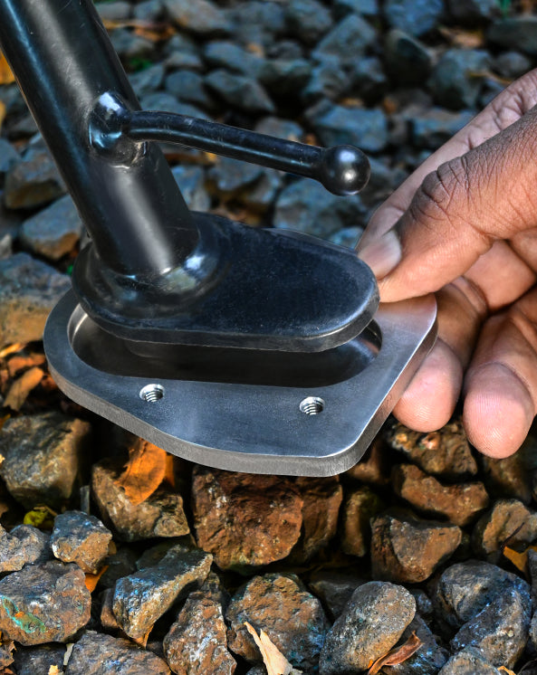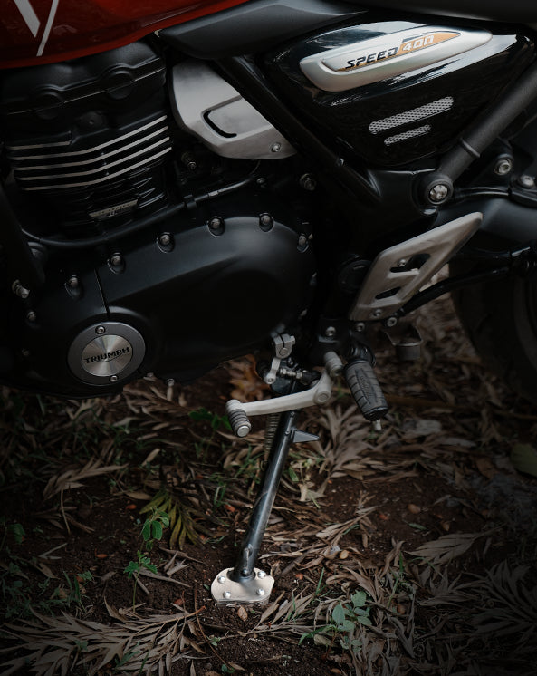 Built for TRIUMPH SPEED 400, this sidestand shoe is precision laser-cut and CNC-machined from SAE 304 stainless steel for long-lasting strength and corrosion resistance. Designed to increase the stand’s footprint by 2.5 times, it spreads weight more evenly to keep your bike steady on soft terrain or uneven ground. The specially designed top plate notch ensures a secure hold, while the minimal 2mm lift retains the bike’s natural lean angle for stability. The CNC-milled cavity accommodates any welding inconsistencies in the stand for a perfect fit.
